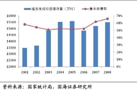 近年來,我國的生活垃圾清運量基本維持在1.5億噸左右。生活垃圾的主要處理方式有衛生填埋、堆肥、焚燒等方式。2007年全國生活垃圾處理設施共460個,其中衛生填埋有366個,堆肥17個,垃圾焚燒66個。03年到07年間,填埋廠的數量呈下降趨勢,從575個減少到366個;堆肥廠的數量從70個減少到17個;而焚燒廠則從47個增加到66個。垃圾焚燒將會逐漸成為生活垃圾處理的主流方式。 我國的環境治理投資主要可分為三個方向:城市環境基礎設施投資、工業污染治理投資、建設項目“三同時”環保投資,三者的比重大致為4:2:4。在城市環境基礎設施投資中,固廢治理的投資占比為4%;在工業污染治理投資中,固廢治理投資占比6%;在“三同時”投資中,固廢治理投資占比為8%。則固廢處理在環境治理投資總額中的占比約為6%。然而隨著城市垃圾問題的日益嚴重,有專家基于03-07年的數據預測,固廢處理投資在環境治理投資結構比重將由6%提升至8%。受益于“調結構”的經濟發展主基調,固廢行業進入黃金發展期!笆晃濉逼陂g,固廢處理投資規模2100億,年均增速18.5%,而環保部中國環境規劃院預測“十二五”期間,固廢行業達到8000億,同比十一五翻兩番,固廢行業進入持續10年以上的黃金發展期。 我國的環保產業發端于“七五”期間,隨著國民經濟的快速增長,我國的環保投入也持續高速增長。按照規劃,“十二五”期間中國環保投資將達3.1萬億,較“十一五”期間1.54萬億的投資額上升121%,年平均增速達24.2%,環保投資力度的加大促進行業的高速發展。中國環保投資占GDP的比重自2001年的1.01%提升至2008年的1.43%,所處的水平與美國環保產業80年代水平相當,該階段為美國環保產業高速發展的后半段,環保產生的增速約為GDP增速的兩倍,因此,若是中國GDP保持8%的增速,2015年環保投資/GDP提升至2.5%,則2015年中國環保投資額將達1.35萬億,2008-2015年復合增長率可至16.97%。 “十一五”期間,中國固廢處理投資規模2100 億,年均增速18.5%,其中的垃圾處理以25%的增速位列環保投資之首,但固體廢物處理問題依舊在惡化,因此中國固廢處理投資規模需繼續加大以抑制這種趨勢。而作為環保產業的重要一環,與污水處理和大氣處理相比,中國目前固廢處理行業仍處于初始階段,產業化程度和市場集中度均非常低,隨著投資規模的快速加大,固廢處理行業也必將高速發展。 業界知名機構EBJ曾將環保行業發展分為4個階段:市場初步發展階段、環;A設施發展階段、加強監管階段以及成熟穩定期。中國現在處于第二階段,即環;A設施發展階段。目前中國環保業的主要驅動因素有重工業化、城市化和高污染引發的環保需求。固體廢物處理行業是環保產業的主要子行業之一,是指提供一系列產品和服務來測量、防止、限制和減弱因固體廢物引起的各種問題的行業。  固體廢物可以分為工業固廢、生活垃圾及危險廢物,而后者的數量比重很小。2001年至2009年間,工業固廢的產生量從約9億噸激增到約21億噸,年均復合增長率達到12%。由于生活垃圾的產生量比較難統計,在統計局給出的數據中一般用垃圾清運量指標來代替。生活垃圾的實際產生量約為清運量的兩倍,且清運比逐年上升趨勢。2001-2008年,城市垃圾產量復合增長率為5%,而垃圾清運量的增速僅為2.03%,整體來看,垃圾清運的速度不及垃圾產生的速度,垃圾圍城現象出現,垃圾處理問題開始引起民眾和政府的高度重視。截止2007年,我國未經處理的城市生活垃圾累計堆存量已達70多億噸,侵占土地面積超過5億多平方米,全國660個城市中有約200個城市陷入垃圾包圍之中。深圳市創新投資集團有限公司發展 我國固廢處置行業起步較晚。目前的競爭狀況:一是產業化程度和市場集中度還非常低;二是由于固廢行業尚處初期階段和處置技術工藝較復雜等多種因素,競爭格局尚沒有最終確立,市場競爭處于無序狀態。 目前優勢競爭者數量有限。我國固廢傳統上采用填埋工藝,新興的堆肥、焚燒法處置固廢都屬于新興產業,目前來看,這兩個市場核心環節競爭參與者數量都較為有限。生活垃圾焚燒領域,金州環境、光大國際、天津泰達、首創集團、上海環投、威立雅、桑德環境(原合加資源)、偉明環保、豐泉環保、深圳綠動力、杭州錦江等十余家企業目前瓜分了整個市場;堆肥法下,目前僅桑德環境屬于大型企業。從競爭格局來看,總體上,這一領域具備相當實力的競爭者數量依然有限,其中,桑德環境、金州環境、偉明環保等非國有企業立足于先發優勢、技術和機制優勢競爭實力日益突出,而幾大城市環衛集團借助于資金和地域優勢和引進海外合作方,在大型項目上也占據了一定市場份額。