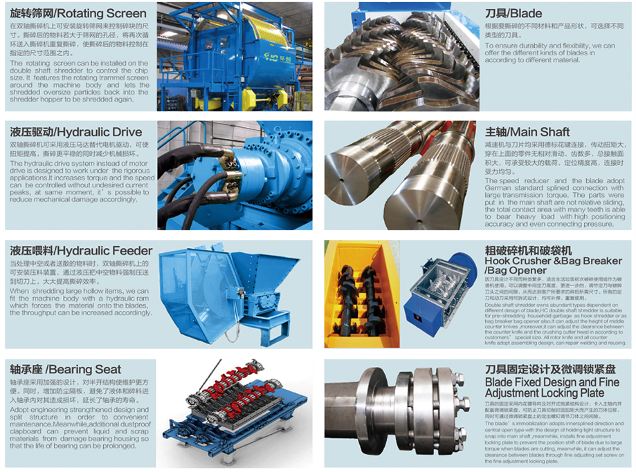 環(huán)創(chuàng)DS系列雙軸撕碎機可滿足各行業(yè)的廢料回收要求,適合撕碎較厚難碎的物料如:電子垃圾、硬質(zhì)塑料、金屬、木材、廢舊橡膠、包裝桶、托板等。可回收材料種類繁多,經(jīng)撕碎后的物料可直接回收或根據(jù)需求作進一步細化處理。適用于工業(yè)廢棄物回收、醫(yī)療回收、電子制造、托板制造、木材加工、生活垃圾回收、塑料回收、輪胎回收、造紙等行業(yè)的應(yīng)用。該系列雙軸撕碎機擁有低速、大扭矩、低噪音等特點,采用西門子編程系統(tǒng),可以自動控制、設(shè)有啟動、停止、反轉(zhuǎn)以及超載自動反轉(zhuǎn)控制功能。