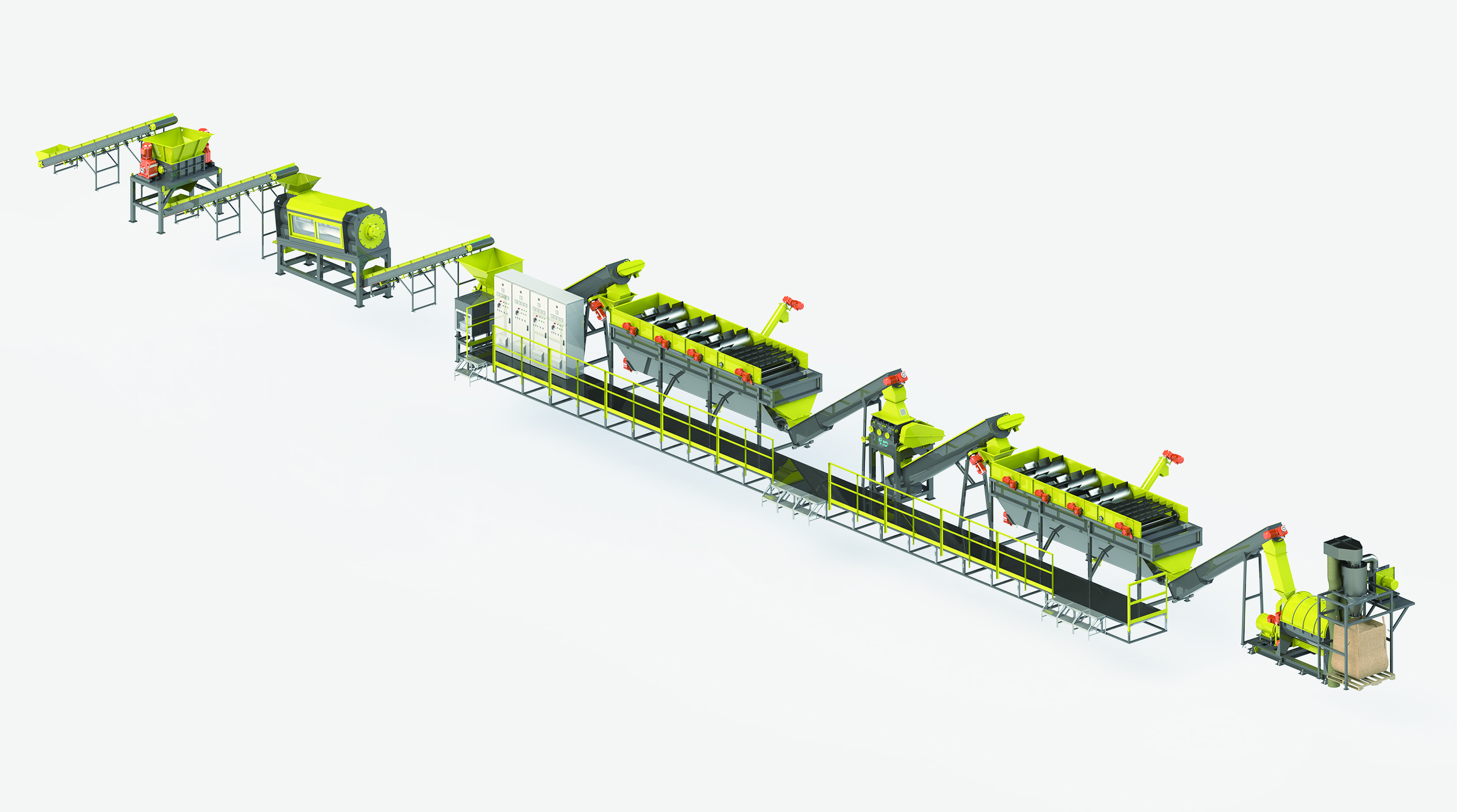 1.入料輸送帶-成捆或松散薄物料的均勻喂料,也可以用叉車將成捆物料不經過輸送帶直接投入撕碎機 2.撕碎機-帶水撕碎物料,在撕碎同時進行預洗 3.預洗機-去除部分泥沙以及可能含有的砂石之類的異物 4.漂洗分離器-清洗物料,去除部分泥沙和雜質,分離不同密度的物料 5.粉碎機-帶水粉碎并清洗 6.高溫煮鍋-高溫清洗物料,將膠水溶解。主要用于PET瓶清洗 7.臥式摩擦清洗機-高速清洗,水從篩網孔排出,減少物料進入下一步清洗時表面附著的含雜質和含雜質的液體 8.離心脫水機-去除物料表面的大部分水分 9.熱風干燥系統-近一步烘干物料 10.脫標簽系統-去除可能剩余的標簽,主要用于瓶料清洗 11.裝袋系統 12.控制電柜